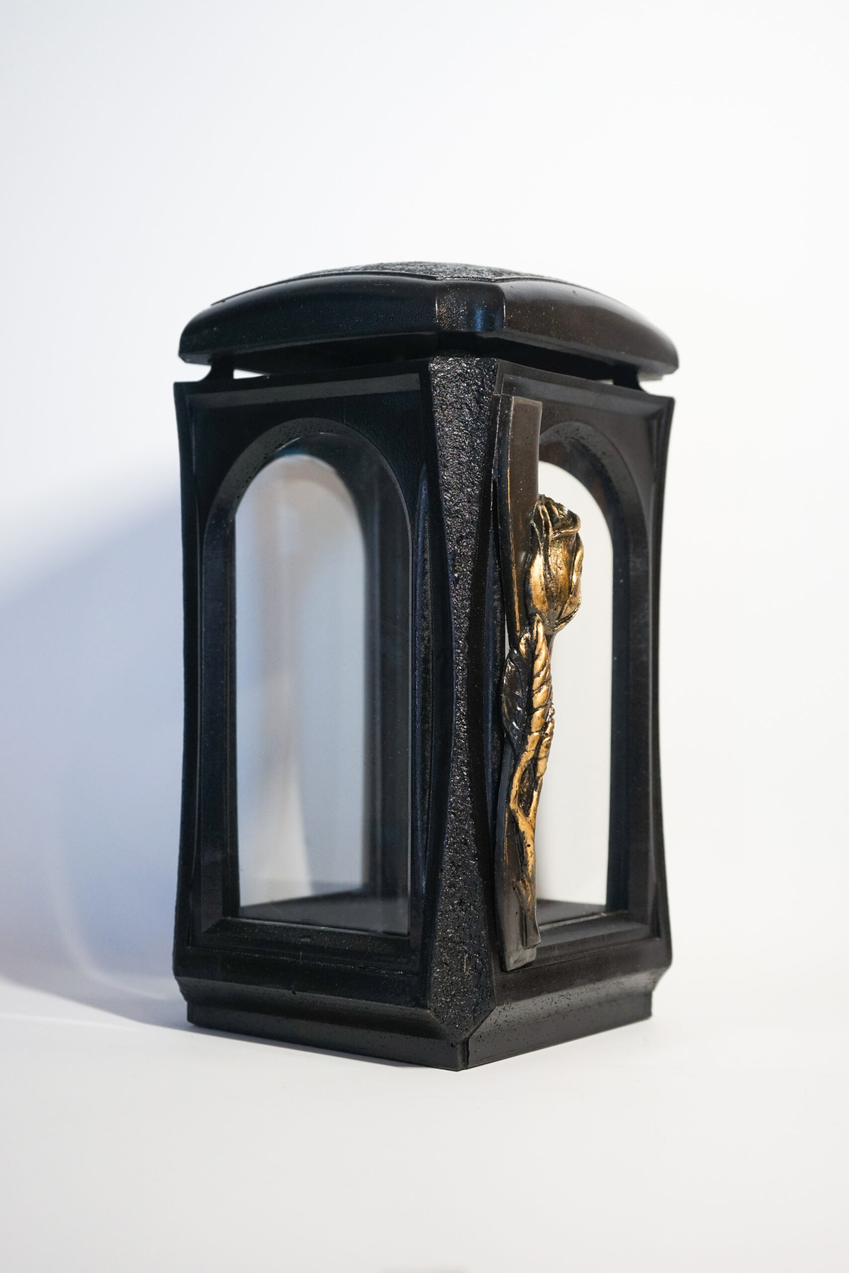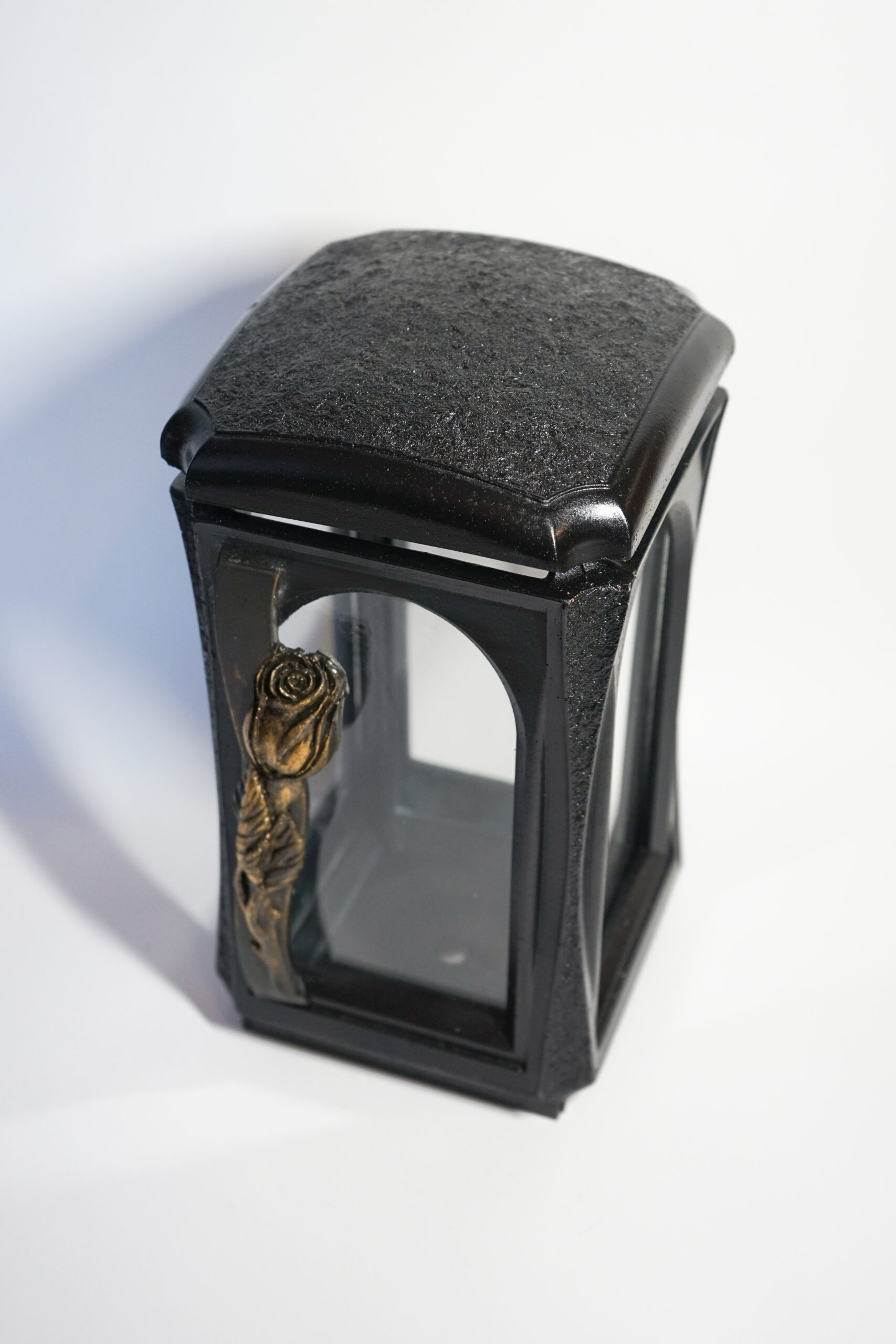 Napisz pierwszą opinię o „Czarny znicz żywiczny lampion retro, motyw róży”