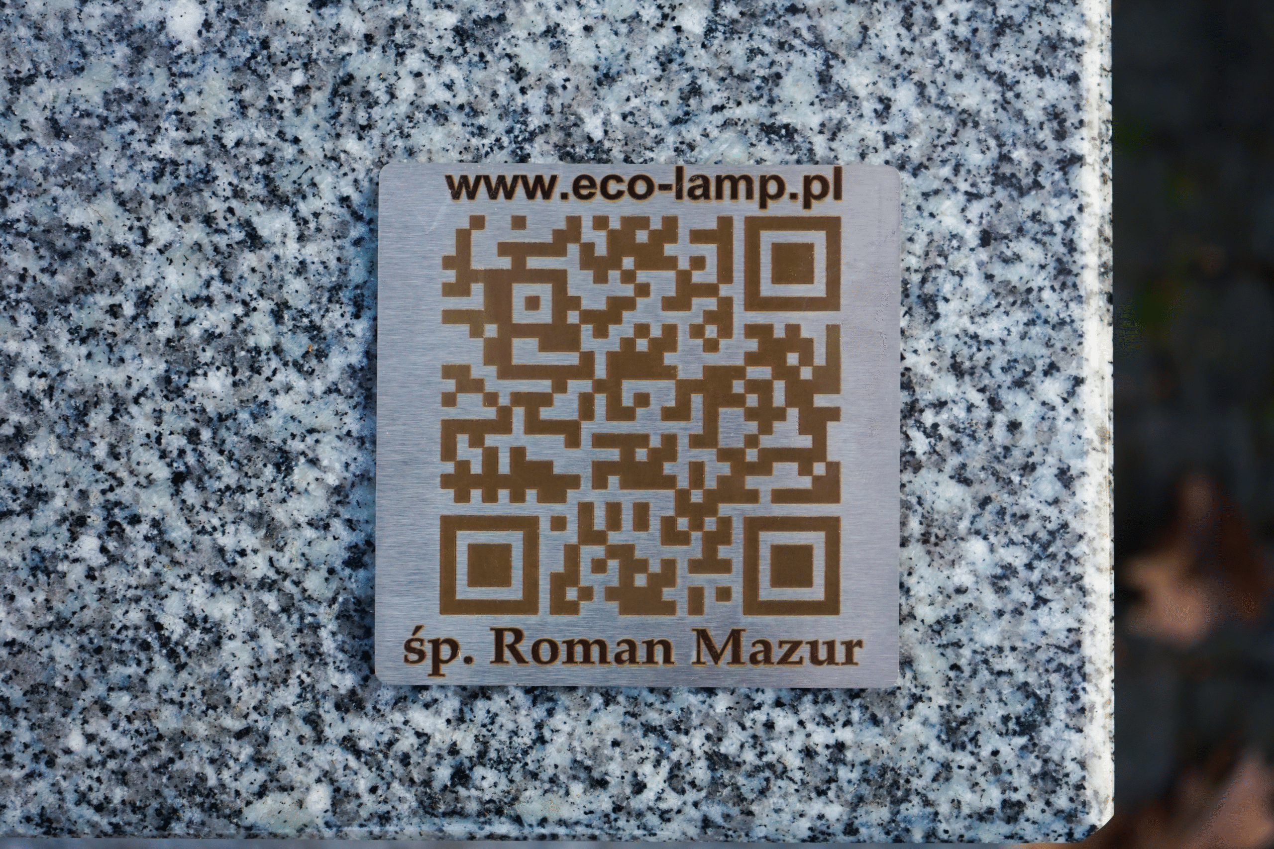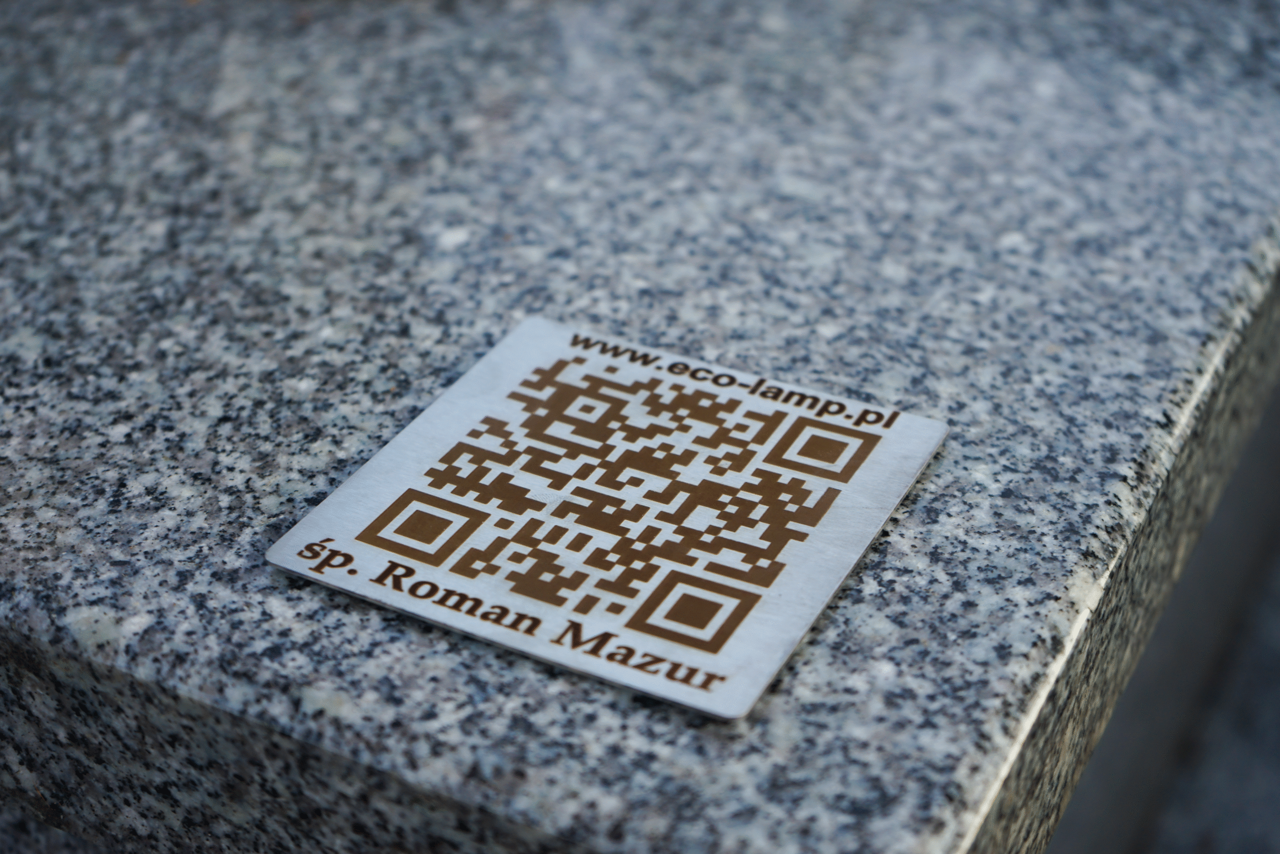 Materiał: Wysokiej jakości stal nierdzewna odporna na UV, deszcz i mróz. Kod qr oraz imię i nazwisko zmarłego wygrawerowane laserem.