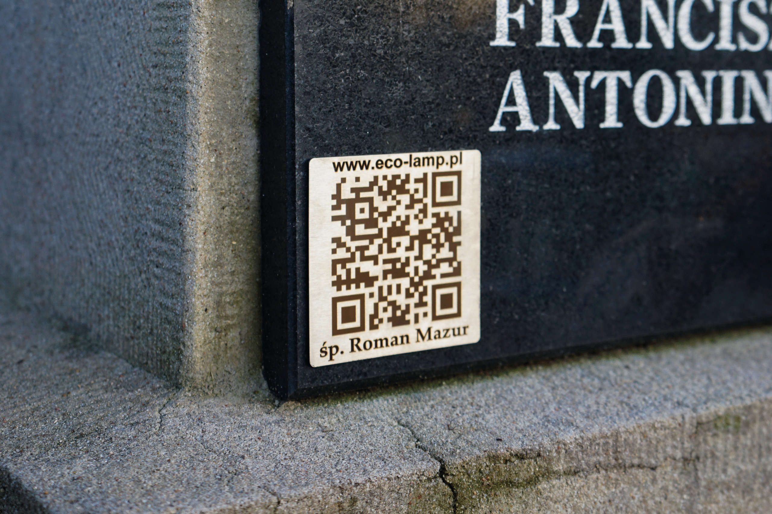 Wymiary: Dyskretny format (10×10 cm), który nie dominuje nad nagrobkiem, ale jest czytelny dla telefonu.