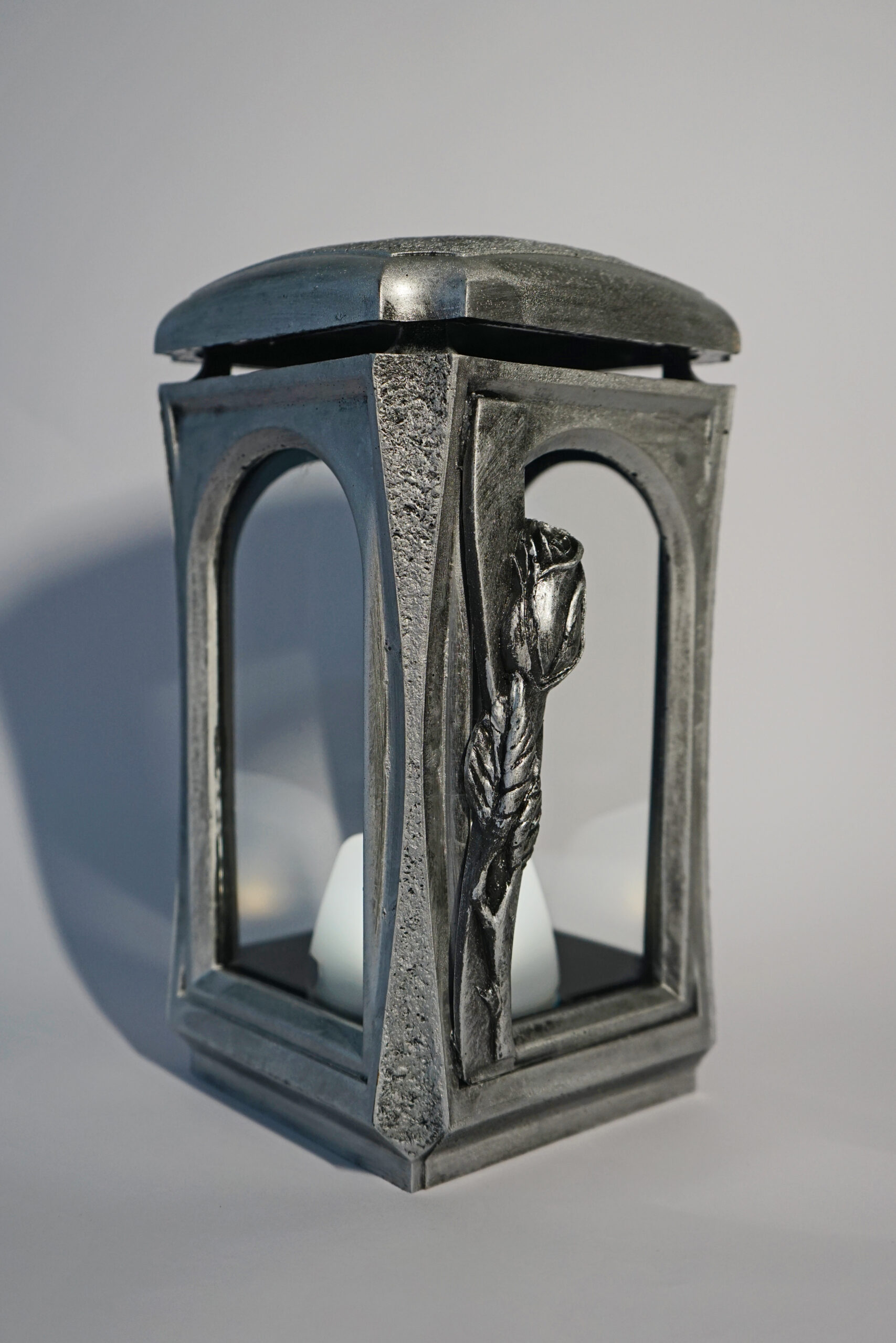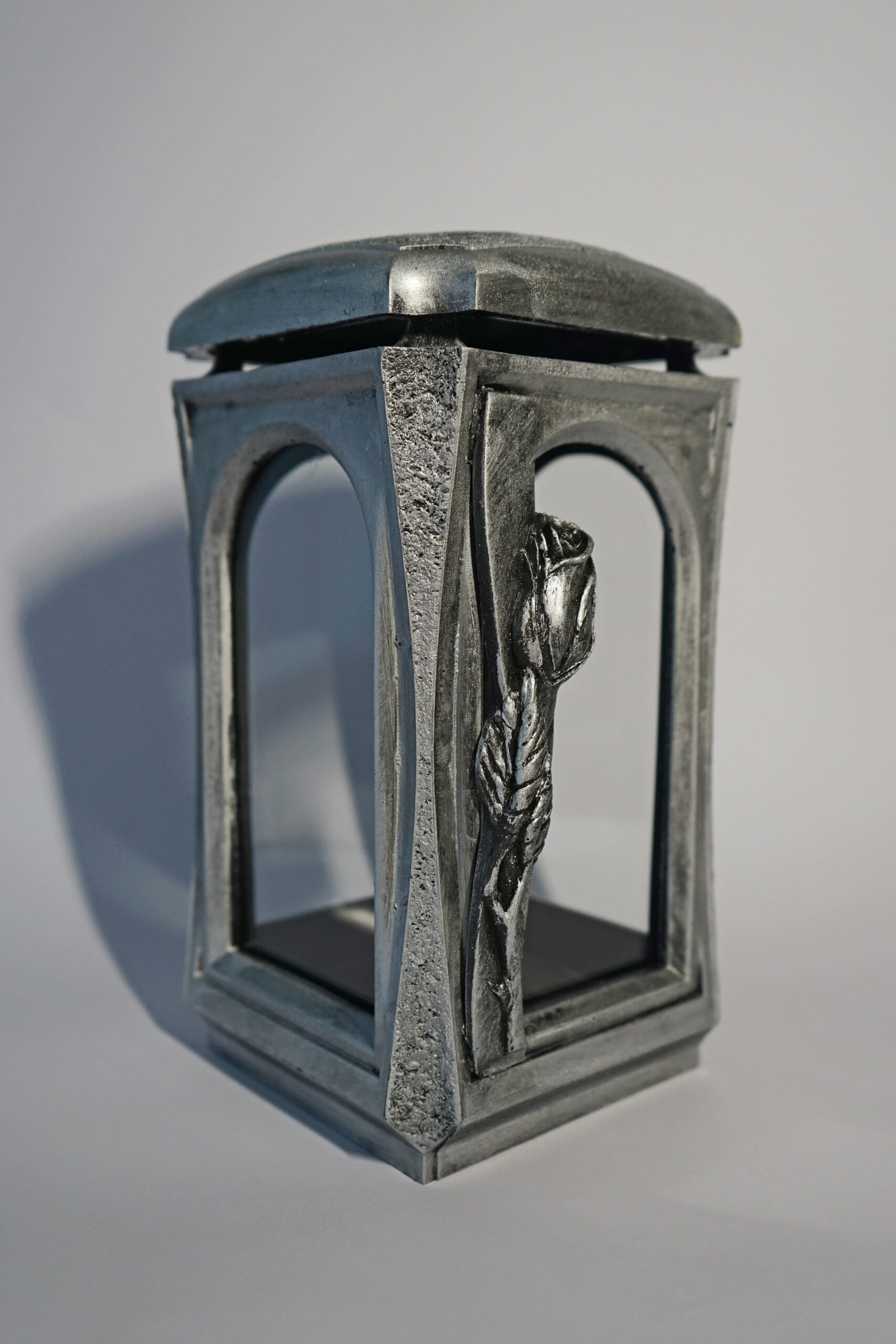 Srebrny znicz żywiczny lampion retro, motyw róży