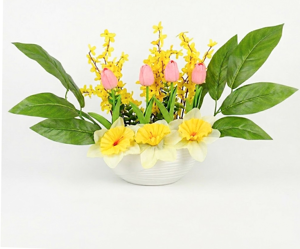 Stroik osadzony jest w klasycznej, białej misie o kształcie łódki z delikatnymi, poziomymi żłobieniami, która wspaniale podkreśla jasne barwy roślin. Wykorzystanie wysokogatunkowych materiałów sprawia, że sztuczna dekoracja jest trwała i odporna na zmienne, wiosenne warunki atmosferyczne, zachowując swój urok przez długi czas.