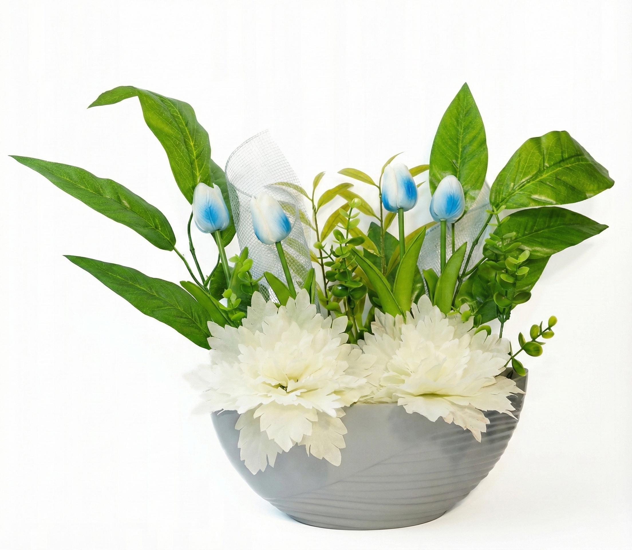 Centrum dekoracji stanowią dwa okazałe, gęste kwiaty w kolorze białym, które tworzą jasną bazę dla smukłych tulipanów o cieniowanych, błękitnych pąkach. Całość została wzbogacona zróżnicowaną zielenią – od dużych, lśniących liści po drobne gałązki bukszpanu i eukaliptusa – oraz subtelnym dodatkiem dekoracyjnej siateczki, co dodaje stroikowi lekkości i objętości.