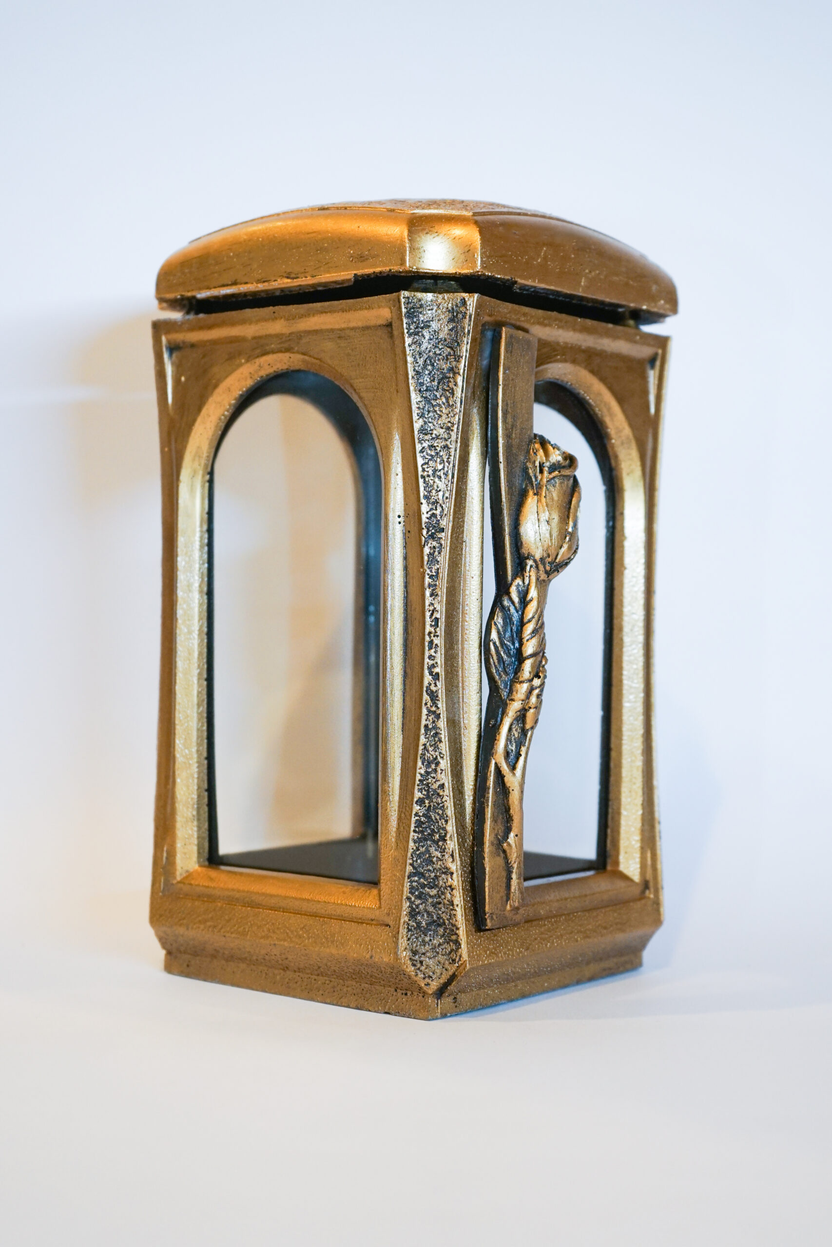 Na froncie znicza znajduje się subtelny motyw róży, który dodaje mu wyjątkowego charakteru i nastrojowej elegancji. Znicz może być używany z wkładami olejowymi, parafinowymi oraz elektrycznymi, co daje pełną swobodę wyboru.